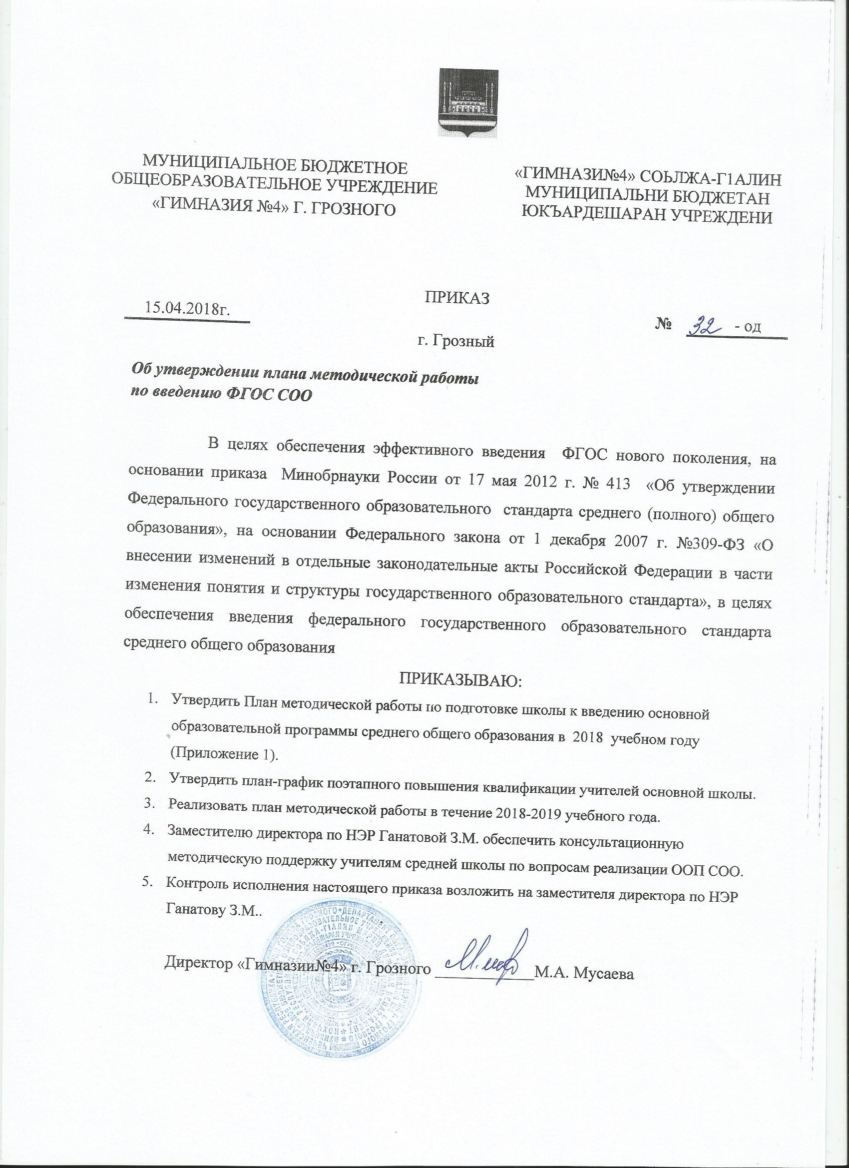 Приказ МБОУ "Гимназия № 4" г. Грозного от 26.03.2025 года №34/01-19 "Об утверждении плана мероприятий, посвященных празднованию Дня чеченского языка в 2025 году"