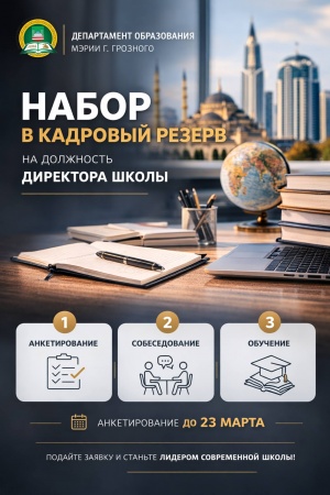В ГРОЗНОМ ОБЪЯВЛЕН НАБОР В КАДРОВЫЙ РЕЗЕРВ ДИРЕКТОРОВ ШКОЛ В РАМКАХ ПРОЕКТА «ДИЗАЙНЕРЫ ОБРАЗОВАНИЯ». В рамках реализации проекта «Дизайнеры образования» Департамент образования Мэрии города Грозного запустил новый трек «Управленцы» для создания ...