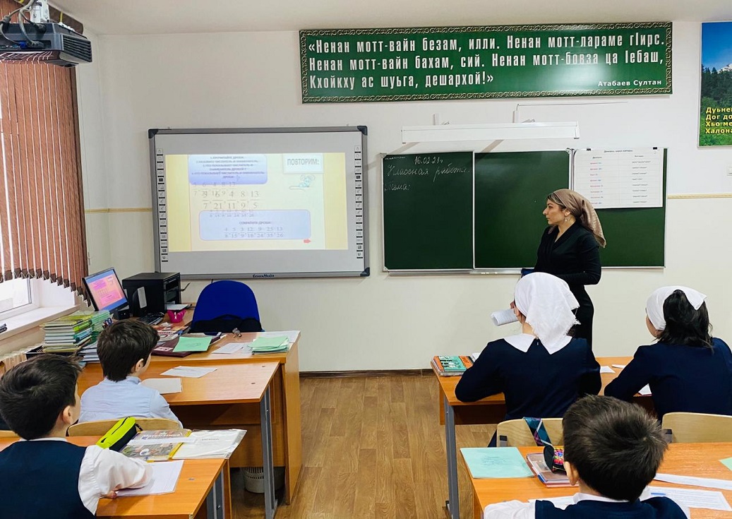 Сегодня в МБОУ "Гимназия №4" г.Грозного учитель математики Базиева Таиса Таировна провела открытый урок в 5 «А» классе.
