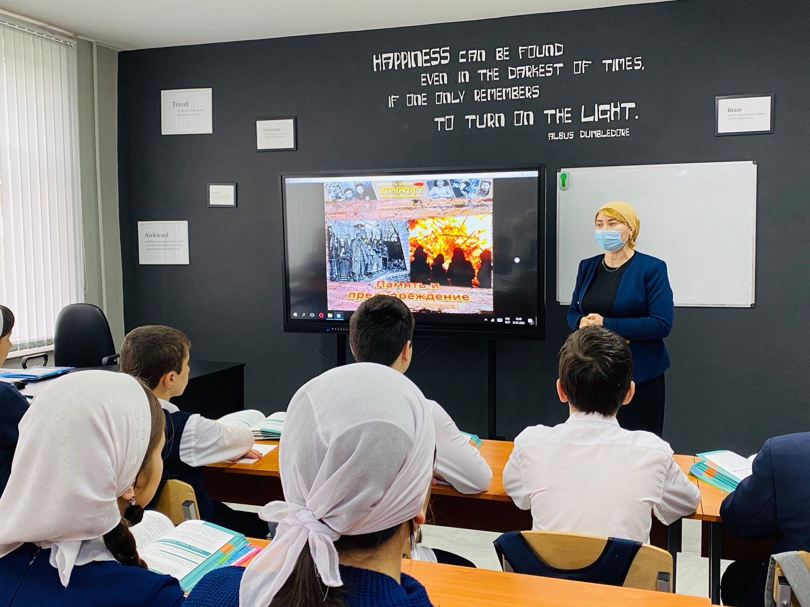 Сегодня в 7 «А» классе МБОУ "Гимназия № 4" г. Грозного прошел классный час, посвященный Международному Дню памяти жертв Холокоста. В классе присутствовало 24 человека. Дети посмотрели небольшой фильм о том, как появились крупные концентрационные лагеря, которые были созданы фашистами в период Второй мировой войны и том, какие события предшествовали этому.