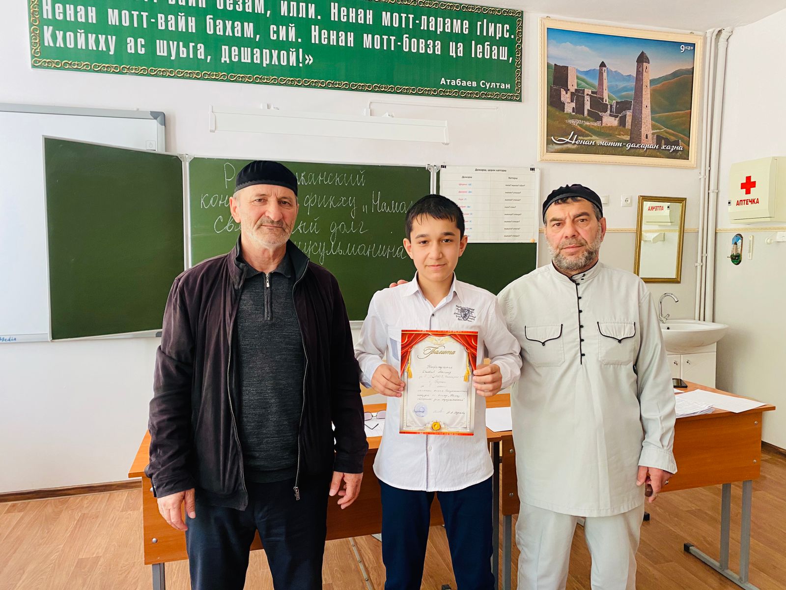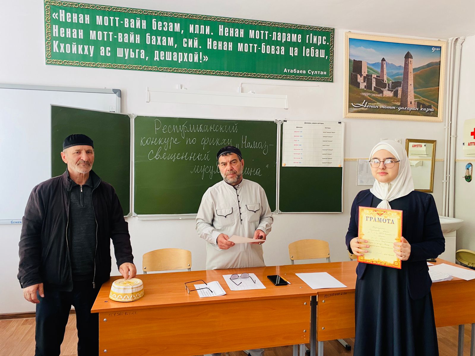 Помимо школьников на мероприятии также присутствовал почетный гость педагог-организатор по ДНВ Батаев М.Х. Первое место заняла ученик 8 «Д» класса Дельбиев М.