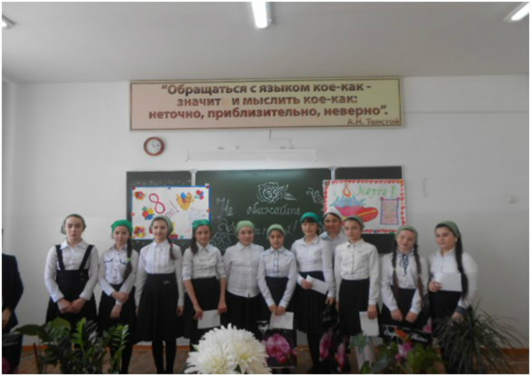Ахматханова М.С. рассказала учащимся о том, когда впервые традиция отмечать 8 марта появилась в России и что этому способствовало.