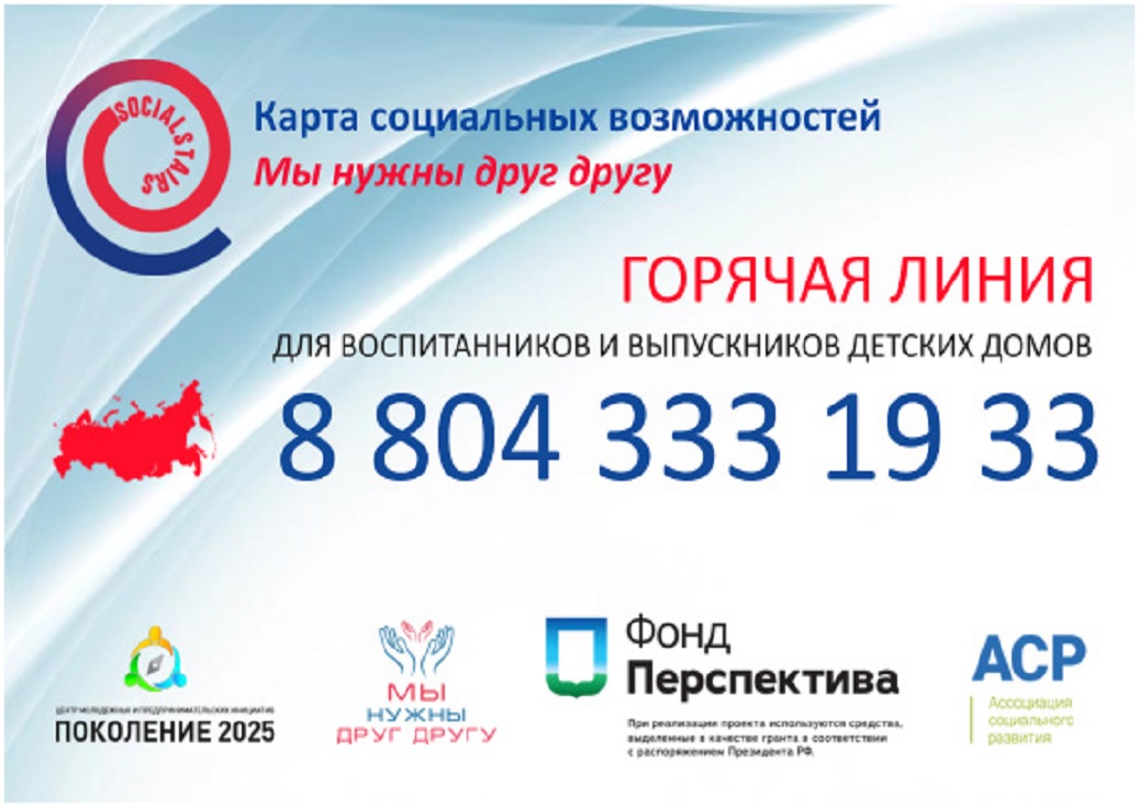 Проект «Карта социальных возможностей» представляет собой комплексный подход к решению задач социализации выпускников и воспитанники детских домов. В рамках реализации проекта в 2017 году запланировано проведение ряда мероприятий в регионах-партнерах: г. Москва и Московская область, ХМАО, Астраханская область, г. Санкт-Петербург и Ленинградская область.